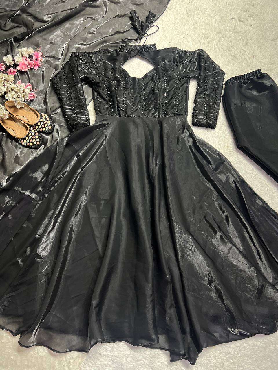 Women’s Silk Heavy Embroidery Sequence Work Long Anarkali Kurti With Pant and Dupatta Set